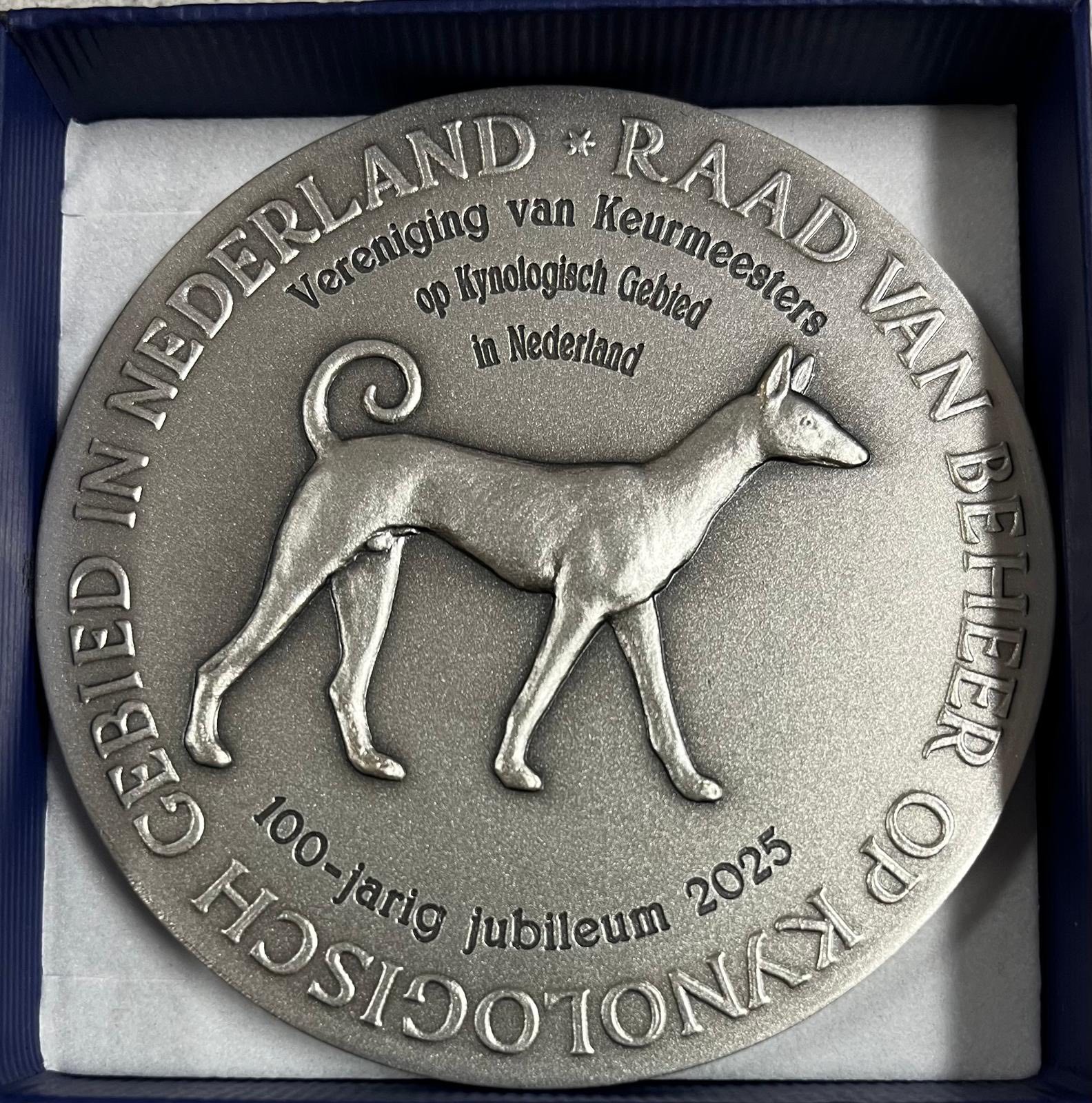 Het bestuur en de aanwezige leden waren zeer verrast op 14 mei 2025 dat de voorzitter van de RvB Hildeward Hoenderken het eerste seminar van 2025 als gelegenheid had uitgekozen om de legpenning en oorkonde uit te reiken ter ere van het honderdjarige bestaan van onze club! Tijdens zijn speech sprak de voorzitter van de Raad van Beheer zijn enorme waardering uit voor de rol en support van de VKK bij de opleiding en examinering van exterieur keurmeesters in Nederland.